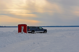 Our roads consist of a nice net work at the clay banks with plenty of parking for wheel houses, and your portables. We do ask that you please get off the road by at least 10ft or more before drilling any holes. You can back into the snow in most places and still be up on solid ice.