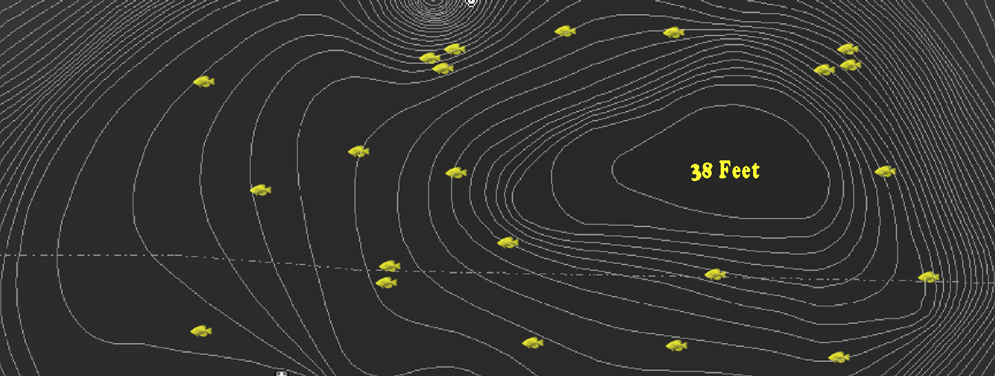 The locations we’re fishing at are mid-lake flats, adjacent to deep water, main basin holes. The holes, like this one, are about 35 feet deep. The flats, like this one, are 26 to 28 feet deep, and the fish, like these, are suspended 2 to 12 feet deep, just below the surface of the water.