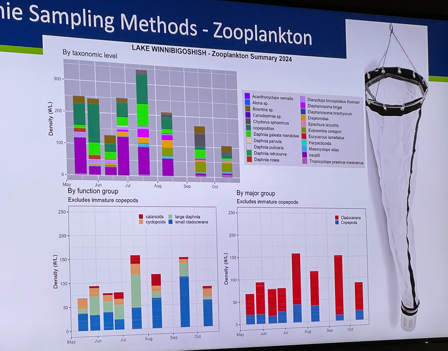 We’ve touched on the topic of food chain, growth rates and fish survival before. But after seeing the presentation, I realized that I need to bring you a lot more information about the health of Winnie’s most fundamental food source. Beginning about 3 days after hatching, walleyes become totally dependent on zooplankton for survival. Most likely to produce a good year’s class of walleyes is a combination of good supplies of zooplankton, fast growth rates and healthy, fat fingerlings going into the winter. So, monitoring the health of the zooplankton populations is critical to making predictions about future management strategies.